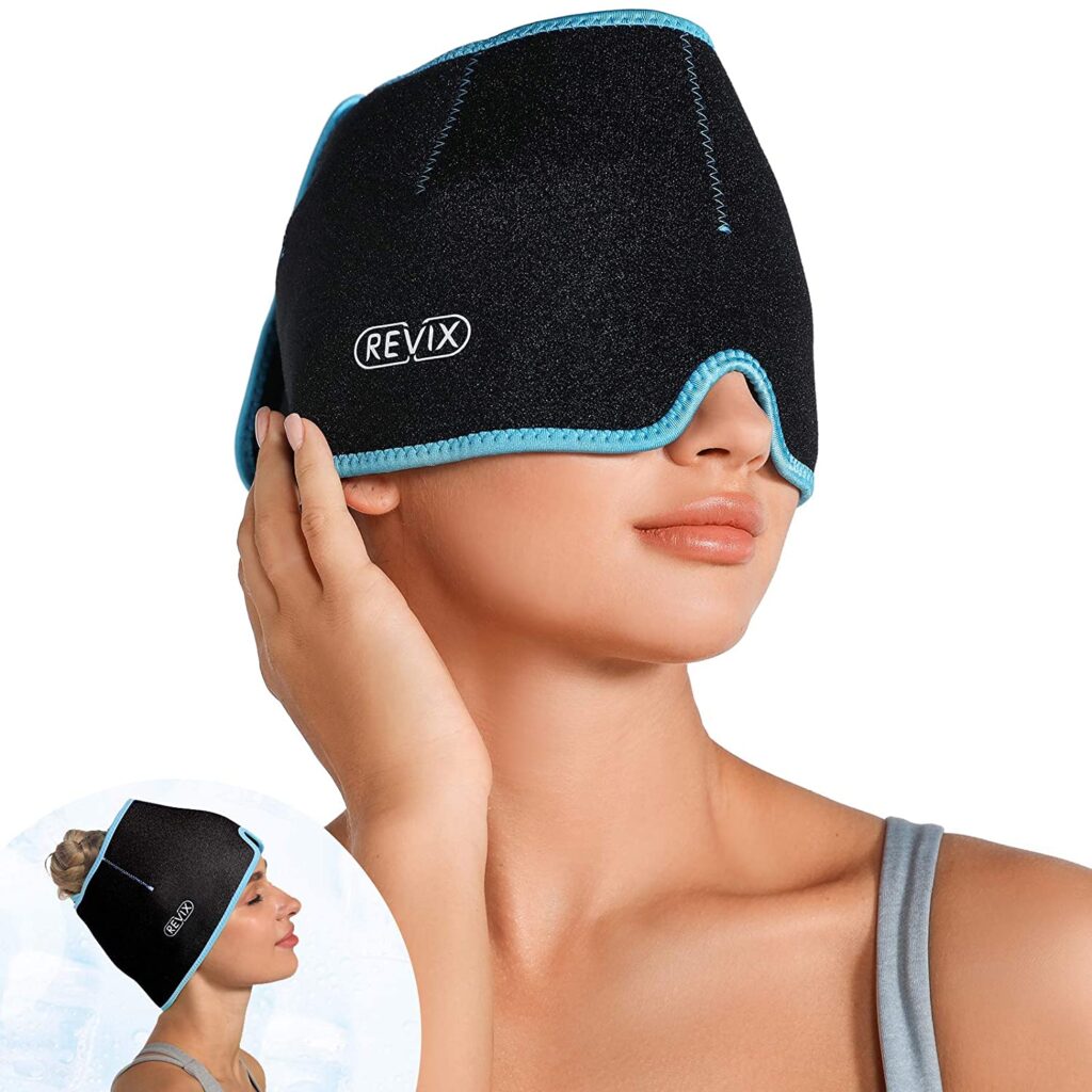 Revix claims that ice hat wraps effectively relieves inflammation, headache, migraine, puffy eye, and more. The only downside is that it has to be wrapped around the head instead of simply pulling over the head and face.