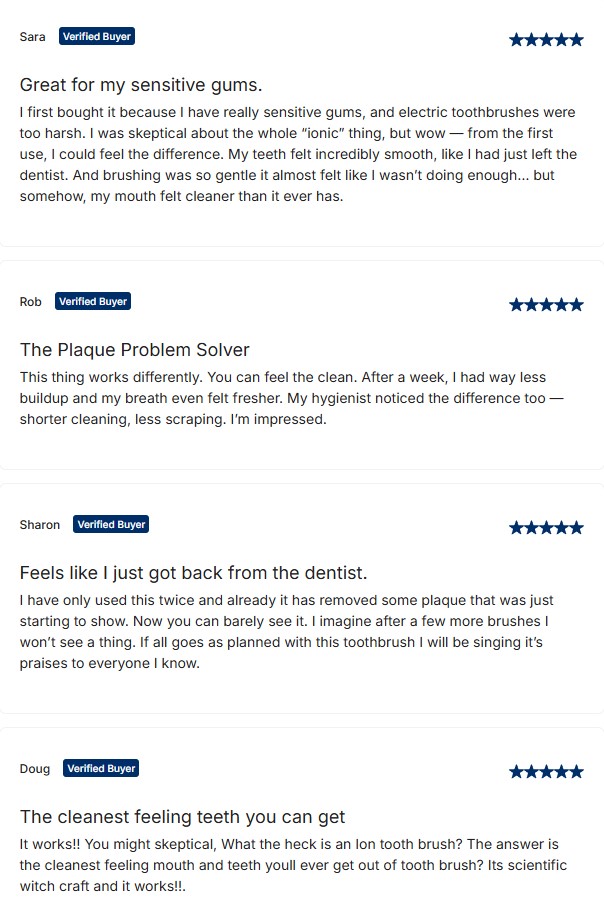 Some say their mouth has never felt this clean without a dentist visit. Others are surprised at how gentle the brush feels, yet how fresh their breath stays all day. Many have even said their dentists noticed a difference less plaque, healthier gums, and fewer signs of early gum disease.