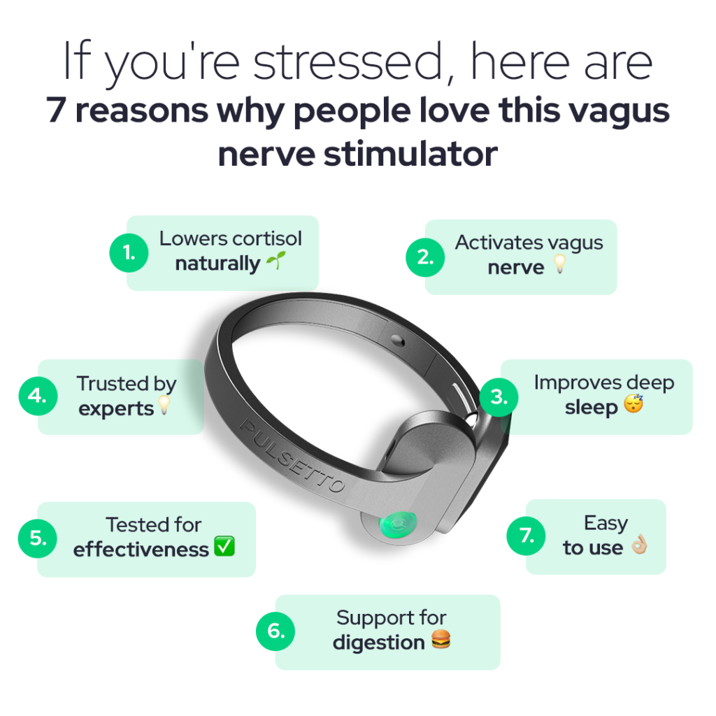 This wearable device uses gentle, painless impulses to naturally stimulate your vagus nerve helping your nervous system shift out of stress and into balance. Over time, Pulsetto helps slow your heart rate, deepen your breathing, and quiet your thoughts without pills or side effects. You can use it in the morning to feel clear and focused, or in the evening to relax and sleep better.