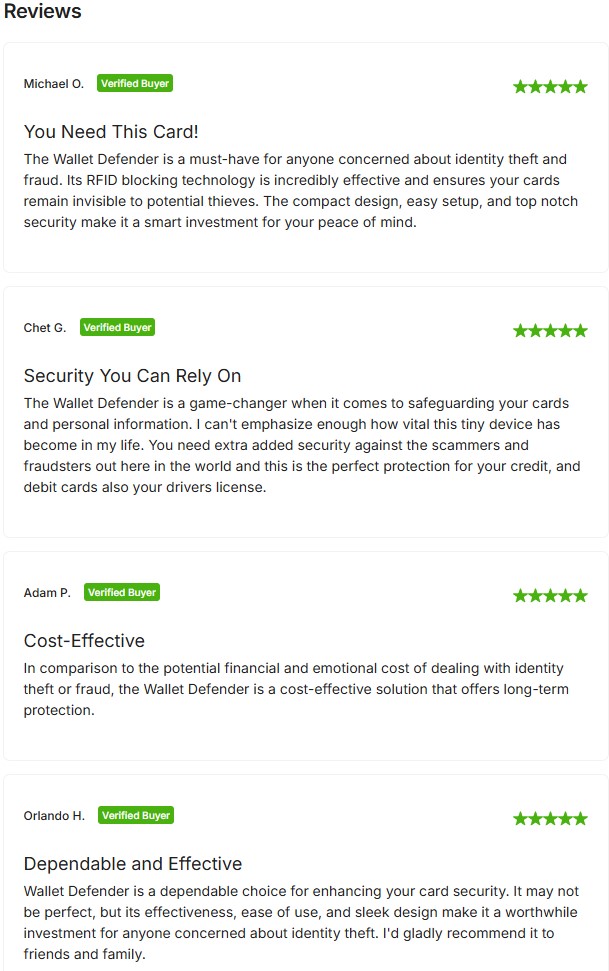Chet G. shares a similar view, describing Wallet Defender as a "game-changer" in personal security. He trusts it to protect not just his credit cards, but also his driver's license anywhere, anytime.